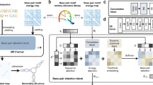 Based on the query sequence, the SS is predicted by two complementary methods: RNAfold32 and PETfold33, which are concatenated in the network. Here, consistent with the requirement of DRfold, both RNAfold and PETfold are configured with sequence input only. The predicted SS is in the form of a matrix, where the entry is set to 1 if the corresponding residue pair forms a base pair. We also include the SS probability map predicted by the considered methods, which brings in another 2 channels for the pair input. Thus, given a sequence of length L, the sequence feature (1-D) and the pairwise feature (2-D) have the shapes \(L\times 5\) and \(L\times L\times 4\), respectively, where ‘4’ is from 4 SS channels (Fig. 1A).