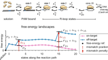 Taken together, these results suggest that there are 3 main factors, namely target sequence contribution, mismatches and fidelity-increasing mutations, that collectively determine whether an IFN will cleave a target or any of its off-targets. Our results also imply that these three main factors affect SpCas9 activity in a similar way. Former studies have shown that both the mismatches and the fidelity increasing mutations in eSpCas9 and SpCas9-HF1 loosely trap SpCas9 in a catalytically inactive intermediate state and slow down the transition of the HNH domain to the active state24,36,37,38,39,40. Mismatches, both PAM-proximal and PAM-distal when bona fide off-targets are engaged, inhibit the HNH domain transition and tend to keep the nuclease in this inactive state38,39,40,41,42. Therefore, this is likely the step that is also affected by the contribution of the target sequence. This is supported by the facts that it is the formation of the hybrid helix between the spacer and the target DNA strand that activates the HNH domain transition24,36,37,41,43, and that DNA cleavage efficiencies scale with the extent to which the HNH domain samples an activated conformation44. Thus, altogether, our results suggest that different target sequences can activate this transition to different extent resulting in the target ranking and the characteristic pattern on the heatmaps of Supplementary Fig. 2. Figure 1 shows how the sum of the effects of these three factors, i.e., the activating effect of the target sequence and the inhibiting effects of fidelity-increasing protein mutations and mismatches at the off-target sites, affect SpCas9 cleavage.
