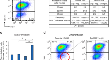 To ensure that tumors originate from PROCR+/EpCAM− cells instead of a minor fraction of contaminating epithelial cells, we sorted PROCR+/EpCAM− cells from the KTB42 cell line (Fig. S15a). Gate for the sort was placed in a such a way that there is limited possibility of EpCAM+ cell contamination. Sorted PROCR+ KTB42 cells transformed with mutant HRasG12V and SV40-T/t antigen (five million) in 50% matrigel implanted into the mammary gland of 6–7-week-old female NSG mice (n = 6) progressed into tumors. We characterized the cell line established from the tumor to determine the expression of PROCR and other phenotypic markers. Human specific antibody against Na+/K+ ATPase CD298 (ATP1B3) cell surface marker was used to sort CD298-enriched human tumor cell populations from mouse stromal cells (Fig. S15a)43. A cell line established from tumor of KTB42- HRasG12V + SV40-T/t transformed cells showed PROCR+ cells similar to transformed cells in vitro (Fig. S15a). Tumor-derived cell line expressed the basal cell marker CD49f similar to transformed cells. Tumor-derived cell line displayed an increase in CD90high/CD73+ cell population compared to transformed cells in vitro (Compare Fig. S15a with Fig. 10c). Tumor-derived cells were CD44+ and CD10+ similar to transformed cells (Fig. S15a). H&E, PROCR, and EpCAM staining of resected tumors revealed PROCR+ spindle-like tumor cells with pockets of PROCR+/EpCAM+ tumor cells (Fig. S15b, c). No lung metastasis was observed.