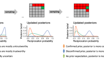 The tactical depth of thinking (i.e. the model of how the agent thought their partner was reasoning about them, see also80,81 was encoded in a separate parameter \(k\in \left\{{{{{\mathrm{0,1,2,3,4}}}}}\right\}\), also called “theory of mind level” (ToM). A level 0 agent holds static (non-learning) models of their partners (dubbed “level −1”) and updates their beliefs about the partner based on those. A level 1 agent models the partner as level 0 (i.e. they are aware the partner is learning about them) and updates their own beliefs based on these models. In general, a level k agent models their partner as level k-1 and updates their beliefs based on a set of level k-1 models for different possible parameter values. We already mentioned our agents are learning about their partner’s inequality aversion (and therefore implicit “trustworthiness”). As described in11, they are also assumed to learn about the partner’s propensity to retaliate harshly (their “irritability”).