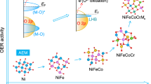 Transition-metal oxides/(oxy)hydroxides have been extensively studied for their potential to trigger the LOM during OER. These include defect-rich RuO2, (La, Sr)CoO3, CoZn (oxy)hydroxides, CoAl2O4, NaxMn3O7, NiFe (oxy)hydroxides, MoNiFe (oxy)hydroxides et al. 7,12,13,14. Experimental and theoretical calculation studies have shown that upshifting the O 2p band to approach the Fermi level (EF) is the key to triggering the LOM of transition-metal oxides/hydroxides. This leads to increased orbital overlap between the O 2p band and metal (M) d band, and strengthens the M-O covalent bond, which makes the redox of lattice oxygen more thermodynamically favorable15,16. However, the participation of the lattice oxygen in OER electrocatalysts can result in the leaching of the metal species on the surface that induces the collapse or phase transition of the bulk phase, leading to poor stability11. As a result, obtaining high catalytic activity and good stability simultaneously, especially under large-current-density OER conditions, remains a grand challenge for most OER electrocatalysts based on LOM17.