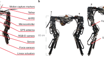 We further leverage the 2D bending SMM to morph a quadrupedal robot’s body shape to enable multiple modes of terrestrial locomotion. The robot’s body is constructed with a 3D printed rigid frame, to which three SMMs are attached in parallel (Fig. 5a). Four legs are connected to the body, with each leg embodying a continuum shape that consists of one carbon fiber rod at the center serving as the spine for the leg. Each leg is actuated by three bare TCAs that run through the holes in several rigid plates along the spine (Supplementary Fig. 11B). We can bend each leg in three-dimensional space to realize a looping trajectory for the foot by independently powering each TCA in specific sequences (Supplementary Fig. 11D). The robot without a control board only weighs 28 g.