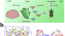 The efficient cytoprotective activity in vitro and good biosafety encouraged us to study the therapeutic effect of MOF-808-Al on OP-induced damage in vivo. The mouse model was established by injecting DENP, MOF-808-Al, and MOF-808-Al + DENP into the tail vein for 8 consecutive days (Fig. 7a)44. As shown in Fig. 7b, the weight loss of the DENP-treated group implies the successful onset of the OP-poisoned model. Noteworthily, the presence of MOF-808-Al significantly alleviates the decrease in body weight loss. Besides, the activity of AChE in the serum of mice was detected to estimate the potential for neurotoxic responses induced by OPs (Fig. 7c). As for the DENP-treated group, the AChE expression is inhibited compared to the control group. With the help of MOF-808-Al, the AChE activity is recovered, which indicates the efficient ability for alleviating the AChE damage, agreeing with the intracellular experiments. The brain and histology changes of mice were tested by using the hematoxylin–eosin (HE) staining. As can be seen in Fig. 7d, Supplementary Fig. 41, the hippocampus, and main organs, including the heart, lung, liver, spleen, and kidney in the MOF-808-Al group show no observable abnormity, further confirming the favorable biocompatibility. However, upon the introduction of DENP, the cellular morphology in the hippocampus presents significant change. Besides, granulovacuolar dystrophy and cytoplasmic vacuolization are observed in the liver and kidney (Fig. 7e). Notably, these damages can be effectively ameliorated with the assistance of MOF-808-Al. Additionally, the levels of three ROS-involved biomarkers in the liver tissues of mice, including superoxide dismutase (SOD), glutathione (GSH), and malonaldehyde (MDA), were evaluated. The elevated MDA level and decreased expression of SOD and GSH induced by DENP are closely related to excessive ROS production (Fig. 7f–h)45. With the aid of MOF-808-Al, the expressions of these biomarkers in DENP-treated tissues are the same as the normal tissues. Furthermore, the alkaline phosphatase (ALP) expression in serum, which is usually regarded to be associated with liver disorders, was tested (Fig. 7i). The increased level of ALP conferred by DENP was reduced as much as in healthy mice with the assistance of MOF-808-Al. Besides, as a control, the MOF-808-Al-treated group exhibits normal expression of biochemical markers. Therefore, the proposed AChE mimics with good biocompatibility exhibit a good protective effect in alleviating neurotoxic effects and inducted tissue injuries.