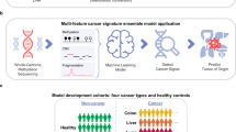 To develop and validate the computational approaches for multicancer detection utilizing WMS-derived cancer genomic features, we applied WMS to plasma cfDNA samples from the MONITOR study, which comprised 780 previously untreated cancer patients and 497 healthy controls recruited from six hospitals. Visualization of healthy controls and each cancer type by t-Distributed Stochastic Neighbor Embedding (tSNE) with each feature suggested no obvious batch effects among the hospital source (Fig. S3). We randomly split the 1277 samples into a training cohort and an independent test cohort at a ratio of 7:3. The training cohort included 352 healthy controls and 542 cancer patients (46 breast (BRCA), 105 colorectal (COREAD), 42 esophageal (ESCA), 78 liver (LIHC), 110 lung (NSCLC), 83 pancreatic (PACA), and 78 gastric (STAD) cancers), 35.1% of which were at early stages (stage I or II). The test cohort consisted of 145 healthy controls and 238 cancer patients (20 BRCA, 45 COREAD, 19 ESCA, 35 LIHC, 47 NSCLC, 36 PACA, and 36 STAD), including 34.5% early-stage disease. With the entire MONITOR cohort, we obtained an overview of the pan-cancer plasma epigenome including DNA methylation (MFR) and fragmentation (FSI and FEM), as well as a pan-cancer CNA landscape (CAFF). Visualization of all four individual genomic features by tSNE plots showed clear separation of cancer patients from healthy controls, supporting their utility for cancer detection. Moreover, cancer samples of the same types appeared to be separable by methylation, fragmentation size, and CNA profiles, suggesting that these features may have cancer type-specific signatures despite the arbitrary segmentation of the genome for MFR and FSI profiling (Fig. 4a). As expected, the clustering of cancer types was more conspicuous in late-stage (III and IV) than early-stage (I and II) samples, but separation of early-stage cancers from healthy controls was still discernible (Fig. S4). This result suggests the potential of these features for sensitive cancer detection across both early and advanced disease stages.