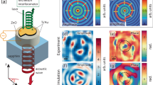 Using the experimental data and numerical \(z\)-propagation of the field, we also calculate the spatial distributions of the transmitted-pulse amplitude \({{|P}}_{{out}}\left(x,z\right)|\) and the acoustic momentum density \({{{{{\boldsymbol{\Pi }}}}}}\propto {{{{{{\rm{Im}}}}}}}[P_{{out}}^{*}\left(x,z\right){{{{{\boldsymbol{\nabla }}}}}}{P}_{{out}}\left(x,z\right)]\) at different instants of time t, Fig. 4. These distributions show the propagation evolution and diffraction of the generated STVP. One can see a doughnut-like spatial shape, distorted by the diffraction but having topologically-protected intensity zero in the center (see Fig. 4c, d). Accurate calculations of the intrinsic OAM carried by the acoustic STVP are beyond the scope of this work, because there is an ongoing theoretical debate about the accurate definition of this quantity33,35,39. Nonetheless, Supplementary Note 4 shows that different equations for the intrinsic OAM yield nearly the same value of \({L}_{y} \, \approx \, 4\) in the units \(\hslash\) per phonon because of the strong elongation of the doughnut-like pulse shape along the z-direction.