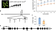 To identify the causative gene responsible for the observed phenotypic changes, we crossed the soybean cultivar Williams 82 to the Gmuid1 mutant, yielding an F2 population comprising 201 individual F2 plants. Of these F2 plants, 153 showed the wild-type phenotype and 48 exhibited the mutant phenotype, thus fitting a 3:1 segregation ratio (χ2 test, P = 0.89). This result indicated that the Gmuid1 mutation affects a single gene and is recessive. We used 128 INDEL markers and the 48 individual F2 plants to map the GmUID1 locus, the results indicated that the mutant locus was mapped to a 4.5-Mb genomic region between markers Gm1005 and Gm0069 on chromosome 11, based on the soybean reference genome from Williams 8251. We then developed new molecular markers within this interval and genotyped a set of 280 individual F2 plants with the mutant phenotype from new F1 inbred offspring, which allowed us to narrow down the interval to a 0.72-Mb region between INDEL markers Gm1008 and Gm1009. We further developed F3 lines from F2 lines homozygous for the Gmuid1 mutation but heterozygous at one of the flanking markers, culminating in a 68-kb region between SSR markers Gm1015 and Gm1016 based on 2250 F2 and F3 individuals. This interval contains six open reading frames in the Williams 82 reference genome51 (Fig. 1d). Independently, we performed a bulk segregant analysis using two sets of pooled F2 plants exhibiting the mutant or wild-type (WT) phenotype (a mix of homozygous and heterozygous plants for the WT allele) to identify all single nucleotide polymorphisms (SNPs) relative to Williams 82 and calculate the SNP index for each pool. The sequencing depth of each pool was 40× genome coverage. This analysis highlighted a region near the top of chromosome 11 (Supplementary Fig. 2a-b), which was consistent with the map-based cloning above. Importantly, we identified one SNP (G-to-A at position 222 of genomic DNA) in the splicing site of the first intron for candidate gene Glyma.11G026400.1 in the Gmuid1 mutant; the remaining five candidate genes showed no SNPs between H12 and Williams 82 (Fig. 1d). The single nucleotide substitution at the splicing site altered messenger RNA (mRNA) splicing and led to premature termination in the new increased exon of the transcript encoded by Glyma.11G026400 in the Gmuid1 mutant (Supplementary Fig. 3). Therefore, we identified a candidate gene for regulating plant height.