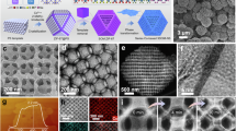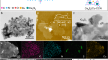 The as-prepared CuInSnS4 nanocrystals belong to the cubic spinel structure (JCPDS No. 29-0548), as revealed by the X-ray diffraction pattern (Fig. 1a), which were prepared through a simple one-step hydrothermal reaction. The hydrothermal temperature (160 °C, 180 °C, and 200 °C) did not have any evident impact on the crystalline and purity of CuInSnS4 (Supplementary Fig. 1). Under similar hydrothermal processes, In2S3 with a tetragonal crystal phase structure (JCPDS No. 25-0390), SnS2 with a hexagonal crystal phase (JCPDS No. 23-0677), and Cu2S with a cubic crystal phase were also prepared (JCPDS No. 02-1284) (Supplementary Fig. 2). The cubic spinel CuInSnS4 crystal structure shows that either In or Sn atom is coordinated with six S atoms to form an octahedron structure, while Cu atom is formed by a [CuS4] tetrahedral structural unit (Supplementary Fig. 3). For comparison, in In2S3 crystals, the In atom is present in [InS4] tetrahedron and [InS6] octahedron coordination (Supplementary Fig. 4). Cu and Sn atoms exist as [CuS4] tetrahedron and [SnS6] octahedron coordination in Cu2S and SnS2 crystal structure, respectively (Supplementary Figs. 5, 6). The coordination structure of each metal in CuInSnS4 coincides with the individual Cu2S, In2S3, and SnS2. The composition of CuInSnS4 is analyzed by energy-dispersive spectroscopy, as shown in Fig. 1b. EDS offers that the Cu, Sn, In, and S atomic ratio is ~1:1:1:4, very close to the stoichiometric value of CuInSnS4 compounds, indicating the high purity of CuInSnS4 nanocrystal. Meantime, the ICP-MS test results of the metal element content of the nano-single crystal CuInSnS4 sample are presented in Table S1. The atomic ratio of Cu:In:Sn is 1.06:1.00:1.00, which closely matches the theoretical value of CuInSnS4. Supplementary Fig. 7 shows the SEM images of In2S3, Cu2S, and SnS2 samples. In2S3 exhibits a morphology of microspheres self-assembled from nanosheets. Cu2S has the basic shape of nanoparticles, while SnS2 displays the morphology of ultrathin nanosheets. Both scanning electron microscopy and transmission electron microscopy images of nanoscale microstructure confirm that the prepared CuInSnS4 displays an octahedral nanocrystal structure with a size of about 30 nm (Supplementary Fig. 8 and Fig. 1c). The high-resolution TEM image (Fig. 1d) shows the exposed facets of the octahedron with a lattice spacing of 0.601 nm, which is assigned to (1 1 1) facets of CuInSnS4. Selected area electron diffraction further verifies that the CuInSnS4 sample not only exposes the (1 1 1) crystal plane but also has a single crystal structure (Fig. 1e). All the results confirm the successful preparation of CuInSnS4 nanocrystal with high-quality exposed (1 1 1) crystal faces. The specific surface area of the CuInSnS4 sample is about 24.1 m2 g−1, while that of the prepared In2S3, SnS2, and Cu2S are 26.8 m2 g−1, 37.6 m2 g−1, and 3.6 m2 g−1, respectively (Supplementary Fig. 9). As displayed in Fig. 1f–i, the uniform distribution of Sn, S, In, and Cu elements in CuInSnS4 octahedral nanoparticles indicates that the catalyst is of high purity.