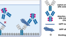 Lyophilized hIAPP was reconstituted at 20 μM in serum-free RPMI 1640 medium (11879-RPMI, ThermoFisher Scientific) and mixed with glutaraldehyde (0, 0.5, or 1%; G6257, Sigma), incubated at 37 °C for 30 min with shaking, neutralized with 100 nM Tris-HCl pH 8 (2:1) and resolved under non-reducing and denaturing conditions by gradient SDS-PAGE (NuPAGE 4–12% Bis-Tris gels, Life Technologies) using NuPAGE LDS sample buffer (without reducing agent; Life Technologies) and NuPAGE MES running buffer (Life Technologies). Resolved proteins were electroblotted (Novex® Semi-Dry Blotter, 5 V, 1 h) onto PVDF membrane. Non-specific binding sites were blocked with PBS + 0.1% Tween® 20 (Sigma) + 2% BSA (Sigma) for 1 h. Membrane was immunoblotted with mouse chimeric chα-IAPP-O (10 µg/ml) and rabbit anti-IAPP antibody (α-IAPP, 1:500; T-4157, Peninsula Laboratories International) in blocking buffer for 1 h at room temperature, washed in PBS + 0.1% Tween® 20, and incubated with goat anti-mouse and goat anti-rabbit IgG (H + L) secondary antibodies coupled to HRP (#115-035-003 and #111-035-045, 1:10’000; Jackson ImmunoResearch). Antibody binding was revealed with HRP substrate (PierceTM ECL, ThermoFisher Scientific) and imaged using an ImageQuant LAS 4000 system (GE Healthcare, Switzerland).