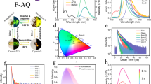 Therefore, the TAH-based co-assembly approach reduces aggregation-caused quenching effect and showed improved condensed state emission, beneficial for optoelectronics and bio-imaging13,43. The steady state PL spectra for all co-crystals displayed a broad emission range from 450 to 700 nm, while gradual red-shifted emission peaks were observed mainly located at λmax = 540, 545, 560, and 590 nm with full-width at half maxima (FWHM) 63, 58, 56, and 72 nm respectively, corresponding to their variation in through-space CT between respective D-A pair44 (Fig. 6g). Absolute PL quantum yield (PLQY) has been determined to be 31.6%, 74.4%, 77.5%, and 64.4% for TAHOFN, TAHTFPN_G, TAHTFPN_O, and TAHTCNB, respectively, using an integration sphere (Supplementary Figs. 34–37). To the best of our knowledge, such high PLQY values (77.5%) for co-crystalline materials are rarely reported. Exact emission colors were calculated from the Commission Internationale de L’Eclairage (CIE) chromaticity coordinates values of (0.36, 0.61) for TAHOFN, (0.39, 0.59) for TAHTFPN (0.48, 0.50) for TAHTFPN and (0.57, 0.42) for TAHTCNB respectively (Fig. 6h). To further understand the in-detail excited state information, the fluorescence decays were recorded at solid crystalline form using TRPL at time-correlated single photon counting (TCSPC) method and the average lifetime (τav) values of 0.50, 0.87, 1.06, and 38.81 ns were recorded for TAHOFN, TAHTFPN_G, TAHTFPN_O, TAHTCNB, respectively (Fig. 6i). Unlike, single exponential decay profile of former three co-crystals, TAHTCNB exhibited tri-exponential decay due to the presence of prompt and delayed species. Additional details on excited-state lifetime fitting values of the co-crystals of polymorph and conformational isomer are summarized in Supplementary Tables 7–10. The radiation constants (kF) of co-crystals were calculated to be 0.62 ns−1, 0.85 ns−1, 0.72 ns−1, and 0.016 ns−1 by using the formula kF = ϕPL/τ, which is a much smaller value than the single component or/and other typical CT crystals45. These, small kF values corroborate, that the fluorescence originated from CT state. To confirm TADF property laser-induced fluorescence (LIF) study was performed by applying nanoseconds (50 ns) and microseconds (0.55, 1.05, 1.55, and 2.05 μs) pulse laser excitation for 0.5 wt% PMMA doped TAHTCNB film (Fig. 6j). Interestingly, a delayed emission spectrum was observed at various μs delay pulse laser excitation, referred as TADF23. The triplet harvesting behavior of TAHTCNB was further confirmed by transient absorption (TA) spectra at room temperature (RT) and 77 K, respectively (Fig. 6k). As expected TA spectra depicted a positive signal near 600 nm at RT, while the intensity was found to be higher than that of 77 K. To verify the TADF characteristics of TAHTCNB, temperature-dependent decay profile for delayed lifetime and delayed emission spectra was recorded at 100–300 K temperatures (Figs. 6l, S38 and Supplementary Tables 11–13). In addition, steady state PL (at RT and 77 K) and 77 K phosphorescence spectra was recorded to obtain experimental ΔEST value of (0.01 eV), collectively confirming the TADF behavior in TAHTCNB co-crystal (Supplementary Fig. 38). Since, the red emissive TAHTCNB co-crystal experiences a rare intermolecular steric strain due to the cis-configuration adopted by TAH, thereby generating unusual supramolecular architecture, which could suppress the non-radiative relaxation and assist in harvesting triplets via an effective RISC process at reduced ΔEST to obtain efficient TADF property46. All the optical properties are summarized in Table 1.