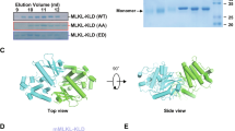 The Monobody, Mb32, binds to the hinge of the pseudokinase domain and thus overlaps with the dimerization interface (Fig. 2c)33. As such, we used Mb32 as a tool to examine whether the pseudokinase domain dimerizes in the context of the full-length human MLKL tetramer. When a recombinant Mb32 bearing an N-terminal His6-tag (His-Mb32) was mixed with the wild-type human p-MLKL tetramer purified following co-expression with RIPK3 kinase domain, negligible amounts of MLKL could be pulled down with His-Mb32 by Ni-NTA (Fig. 2d, e). In contrast, His-Mb27, whose epitope does not overlap with the pseudokinase domain dimerization interface, could pulldown wild-type p-MLKL tetramer. As expected, the inactive T357E/S358E MLKL:RIPK3 heterodimer co-precipitated with His-Mb32 but not His-Mb27, consistent with our earlier prediction that the Mb27 binding site on MLKL would be occluded by RIPK3 in this complex33. As expected, a control Monobody, His-Mb33, which binds the N-terminal 4HB domain59, could co-precipitate MLKL regardless of oligomeric state. These data support pseudokinase domain dimerization occurring within the full-length human MLKL tetramer in solution via the interface observed in the dimeric p-MLKL pseudokinase domain crystal structure. Our findings with recombinant proteins were mirrored in HT29 cells undergoing necroptosis, where Mb27-bound MLKL was assembled into oligomers on BN-PAGE (Fig. 2f), while Mb32-bound MLKL was primarily monomeric. Collectively, these data suggest that RIPK3-mediated phosphorylation drives MLKL oligomerization by switching the pseudokinase domain conformation, which prompts pseudokinase domain dimerization and protrusion of the brace helix to enable tetramerization.