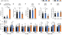 A T-maze and radial arm maze (RAM) protocols (drawing created using BioRender). B Success rates of control (n = 26) and Myrf-cKO (n = 28) adult male mice during T-maze training. Controls improved their success rate over the 8 days of training whereas Myrf-cKOs barely improved [repeated measures 2-way ANOVA: time x genotype p = 0.0012, F(7, 364) = 3.50; time, p < 0.0001, F(7, 364) = 7.16; genotype, p = 0.066, F(1, 52) = 3.52]. Controls attained a significantly greater success rate on the final two days of T-maze training compared to Myrf-cKOs (Day 7: control 74% ± 2.9%, Myrf-cKO 60% ± 3.3%, p = 0.02. Day 8: control 82% ± 2.6%, Myrf-cKO 67% ± 3.3%, p = 0.009, Šídák’s post-test). C Success rates of control (n = 28) and Myrf-cKO (n = 29) adult male mice over 9 days of RAM training [repeated measures 2-way ANOVA: time x genotype v < 0.0001, F(8, 440) = 7.41; time p < 0.0001, F(4, 239) = 39.8; genotype p = 0.009, F(1, 55) = 7.5]. Controls surpassed Myrf-cKOs on days 6-9 (e.g. Day 8: control 77% ± 3%, Myrf-cKO 65% ± 2% p = 0.006. Day 9: control 78% ± 2%, Myrf-cKO 67% ± 2%, p = 0.02. Šídák’s post-test). D Fraction (%) of trials over the full 9 days of RAM testing in which mice recorded no working memory errors (“perfect trials”) [repeated measures 2-way ANOVA: time x genotype p < 0.0001, F(8, 440) = 5.4; time p < 0.0001, F(8, 440) = 19; genotype p = 0.006, F(1, 55) = 8.1]. Control mice (n = 29) recorded more perfect trials than Myrf-cKOs (n = 28) on days 5-9 (e.g. Day 8: control 33% ± 6%, Myrf-cKO 10% ± 4%, p < 0.0001. Day 9: control 31% ± 5%, Myrf-cKO 16% ± 4%, p = 0.03, Šídák’s post-test.). Data are presented as mean ± s.e.m. n.s. not significant (p > 0.05), *p ≤ 0.05, **p ≤ 0.01, ****p ≤ 0.0001. Source data are provided as a Source Data file.