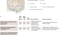 There are several feedbacks (bidirectional interactions) between soil organic matter and plants. In this study, we concentrated on the effect of plants on soil organic matter, which does not rule out a potential influence of soil organic matter on plant biomass or diversity. Soil organic matter contains nutrients and can positively affect soil water holding capacity, which, in turn, can influence plant biomass and diversity. To disentangle the causalities in the feedback between soil and plants and evaluate the dominant direction of the causalities, each variable in this interaction would have to have a sufficient degree of independence in its predictors. We found that the positive correlation of soil nitrogen and Shannon index (Fig. S5) was less strong than the one of SOC and Shannon index (Fig. 2), which is in accordance with earlier work1. In addition, we observed that soil phosphorus, which can also be bound in organic matter, was not significantly correlated with the Shannon index (P = 0.914). Together, these findings suggest that the effect of soil nutrients on plant diversity is smaller than the effect of plant diversity on SOC that is likely caused by a change in the quality of the organic matter, leading to reduced organic matter decomposition (see above). Still, it is likely that soil organic matter and the nutrients therein (particularly nitrogen) also affect plant diversity. A bidirectional, positive interaction between soil organic matter and plant diversity, developed over several decades to centuries14,15,16, likely explains the strong relationship between plant diversity and SOC found in this study compared to biodiversity experiments1,2,3.