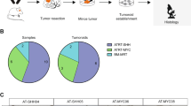 To date, multiple studies in humans have attempted to correlate ATRT molecular subgroups with predominant supra or infra-tentorial anatomical location, failing to accurately correlate the anatomical site with the molecular profiles and to provide information about the putative lineage of origin of each ATRT subgroup2,3,4,54,55. Here, we have investigated by an integrative analysis whether the precise anatomical description could improve the understanding of ATRT development. This approach allowed us to identify four distinct anatomical-molecular subgroups, which in turn allowed us to investigate the putative lineage of origin. We first found that a significant subset of MYC ATRT emerge from extra-axial locations such as cranial nerves; this feature has been repeatedly described in previous case reports56,57,58,59,60,61,62 that we believe, from our own findings, could be related to the lineage of origin of MYC tumors. The location of Myc murine ATRT, arising outside of the brain in the Rosa26-CreERT2::Smarcb1flox/flox model, corroborated the hypothesis of an extra-axial origin for this subtype of tumors. These findings are consistent with (i) the SMARCB1-related schwannomatosis, which tightly links SMARCB1 to oncogenesis in mature peripheral nerves63,64,65,66 (ii) the previously published phylogenetic links between Schwann cells and ECRT, again indicating a possible neural-crest origin for rhabdoid tumors8, (iii) the unique clustering to which MYC ATRT and ECRT belong, already suggesting a common non brain origin for these types of rhabdoid tumors5, and (iv) the typically extra-axial origin of ATRTs in the P0-Cre::Smarcb1flox/flox model, originating from the cranial nerves and the periphery of the brain, locations very similar to the ones we described for human MYC ATRT, and also pointing to neural-crest cell precursors as lineage of origin. In a recently published work, Graf et al. performed scRNAseq on a series of Myc murine ATRT, which was not done in the present manuscript10. Of note, those authors related this tumor subset to primordial germ cells based on correlation with atlases, a finding that does not fully fit with the aforementioned studies. Whether these results reveal some specificity for murine Myc tumors, some diversity among the potential origins of Myc tumors, or simply indicate that SMARCB1 abrogation can, in some contexts, erase all specific preexisting gene expression in such a deep manner that the transcriptome matches with primordial germ cells, remains to be further demonstrated. Further work is therefore needed on human and mouse MYC ATRT to fully elucidate this enigma.