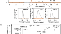 Alternatively, lipids were analyzed by LC/MS in both positive and negative mode on a high-resolution Agilent 6220 TOF mass spectrometer interfaced to a LC as described45. For quantification purposes, 20 µl of 1 mg/mL pre-mixed deuterium-labeled internal glycerophospholipid standard (SPLASH LIPIDOMIX Mass Spec Standard from Avanti, Polar Lipids, USA) was added to the total lipids prior to injection. Data files were analyzed with Agilent’s Mass hunter workstation software (Version B.02.00, build 2.0.197.0) to identify compounds using “molecular feature extractor”. Agilent’s mass profiler program was used to compare the various lipids present in analogous control and recombinant strains. Most lipids were identified using a database of Mtb lipids developed in-house45. Peak areas of the extracted ion chromatograms (EICs) for monoacylglycerides, DAG, and TAG were obtained in positive ionization mode to quantify glycerophospholipids compositions. EICs for LPE, PA, PS, PG, PE, CL, PI, Ac1PIM2, and Ac2PIM2 were obtained in negative ionization mode. Peak areas of EICs for deuterium labeled 15:0-18:1(d7) PI were used to quantify CL, Ac1PIM2, and Ac2PIM2. Peak areas of EICs were used to calculate the relative abundance of saturated vs. unsaturated glycerophospholipids. See Supplementary File 1 for more details about the LC/MS procedures used in this study.