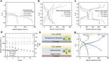 Aqueous rechargeable batteries in which naturally abundant alkaline ions (Na+ and K+) and multivalent cations (Mg2+, Ca2+, Zn2+, Al3+, Mn2+, etc.) are employed as charge carriers have been extensively investigated10,11,12,13,14,15,16,17. Among the candidate systems, aqueous copper-based batteries are attracting considerable attention owing to the distinctive merits of copper negative electrodes, such as their high theoretical specific capacities (gravimetric capacity of 844 mAh g−1 and volumetric capacity of 7558 mAh cm−3), favourable stability, and the abundance of copper in the earth18,19. Recently, some work on positive electrode materials for copper-based batteries has been reported. For example, Prussian blue analogue, an open-framework positive electrode, exhibited high cycling stability and ultrafast kinetics due to the intercalation of Cu2+ ions20. To achieve high energy density, sulphur and selenium with conversion mechanisms were employed as positive electrodes, which enabled the realisation of four-electron transfer based on redox-active Cu2+ ions, resulting in high discharge-specific capacity21,22. Although some improvements have been made in terms of discharge capacity and power delivery, the relatively high potential of copper negative electrode (~0.34 V vs. the standard hydrogen electrode, SHE) in these copper-based batteries has generally resulted in low full-cell voltage (~1.0 V), substantially limiting the energy output and further practical application of copper-based batteries.