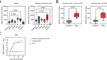 We next performed transcriptional analysis of the organoids to confirm tissue-specific gene expression patterns. The distal and proximal intestinal organoids expressed the intestine-specific genes Vil1 and Cdx2 as well as Ace2, while the gastric organoids showed increased expression of the chief cell marker pepsinogen C (Pgc) (Fig. 1d). For two representative lines of the distal intestine, expression of the intestinal markers Muc2, Vil1 and Cdx2 remained relatively stable over eight passages (Fig. 1e), with a significant increase of villin expression in p7 but no clear trends overall. Expression of Pgc and Ace2 also remained stable (Fig. 1e). While Pgc is predominantly expressed in the stomach, expression in the small intestine has been described in humans53. Notably, copy numbers for Ace2 were very low compared to the other targets.