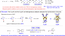 The N-heterocyclic imidazolium salt 4,5-diphenyl-1,3-bis(pyridin-2-ylmethyl)−4,5-dihydro-1H-imidazol-3-ium chloride was designed and synthesized by the condensation reaction and the nucleophilic substitution transformation (Supplementary Fig. 1), forming a model tridentate NHC ligand including a 5-membered N-heterocyclic carbene and two pyridines of DLL in NCs (Fig. 2a). Cu3NC(NHC) was prepared using the designed tridentate NHC ligand and copper powder as the copper source. The [Cu3(BINAP)3CO3](tBuSO3) (Cu3NC(BINAP)) and the Cu3(3,5-Ph2-Pz)3 (Cu3NC(Pz)) were synthesized by employing 2,2-bis(diphenylphosphino)−1,1-binaphthyl (BINAP) and 3,5-diphenyl-pyrazole (Pz) ligands, respectively, through solvent diffusion methods42,43. More synthetic details can be found in the Supplementary Information. Single-crystal X-ray analysis revealed that Cu3NC(NHC) contained a triangle Cu3 metal kernel that was stabilized by three NHC ligands, in which three PF6- anions balanced the charges (Fig. 2b). Due to the perpendicular orientation of the carbene ligands to the Cu3 face in Cu3NC(NHC), the pyridine rings of the NHC ligands could alternate their coordination above and below the Cu3 plane. Of the three NHC ligands, all ligands bonded to the Cu3 core in the same coordination manner via Cu−C bonds and Cu−N bonds, which improved the Cu3NC(NHC) rigidity and the stability of Cu3NC(NHC). The flexibility of Cu3NC(NHC) originates in the flexible bonding and dissociation between pyridine groups of ligands and Cu centers. When the original pyridine moieties in DLL ligands were dissociated from Cu3 core in the catalytic systems, pyridines could rotate freely to decrease the steric hindrance around the copper center, making the catalytic center exposed to the catalytic substrate. While the reaction was completed, pyridine groups reversibly coordinated to Cu atoms, restoring the original structure of the cluster. The flexibility ensures the stability and reversibility of this copper cluster catalyst. The Cu···Cu distances of Cu3NC(NHC) ranged from 2.4960 to 2.5238 Å with an average distance of 2.5124 Å; this value is shorter than the sum of the van der Waals radii of copper (2.8 Å), suggesting the presence of strong metal-metal interactions44,45. To ascertain the exact molecular masses and formulas of the clusters, Cu3NC(NHC) and Cu3NC(BINAP) were further characterized by electrospray ionization mass spectrometry (ESI‒MS) in positive mode (Fig. 2c, Supplementary Figs. 7 and 8). For Cu3NC(NHC), the spectrum depicted prominent peaks at m/z 1693.316, corresponding to the molecular ion of [Cu3(NHC)3(PF6)2]+ (calcd m/z 1693.315) (Fig. 2c). For Cu3NC(BINAP), the peak with high abundance at m/z 2118.375 was assigned to [Cu3(BINAP)3CO3]+ (calcd m/z 2118.375) (Supplementary Fig. 8). The molecular ion peaks of Cu3NC(NHC) and Cu3NC(BINAP) were in precise agreement between experimental and simulated isotopic distributions.