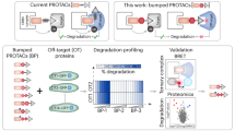 Tools that allow conditional control of protein concentration are essential for understanding protein function. Several strategies have been developed to regulate proteins at different stages of the central dogma. For example, DNA-modifying technologies such as CRISPR/Cas91 and RNA interference-based techniques2 (RNAi) modulate protein expression at the genomic and mRNA level, respectively. While both approaches are widely used given their relatively straightforward nature, they have limitations. Genome editing is generally irreversible and RNAi-based regulation depends on the inherent turnover rate of the protein of interest (POI), and therefore suffers from a relatively slow onset of action. This limits the temporal windows to modulate stable proteins with a long half-life3 and could enable proteome rewiring in response to the loss of POI, thus confounding biological discovery. Furthermore, these techniques present challenges for in vivo delivery and function, as they require viral vector or lipid nanoparticle-based distribution systems4,5.