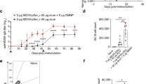 All immunizations were given subcutaneously (s.c.) in the left and right mid-thighs. Animals were immunized per side according to their respective study group, as follows: (i) Group 1 (MD39 + alum) with 50 µg MD39 and 500 µg alum (Alhydrogel adjuvant 2%, InvivoGen); (ii) Group 2 (pSer-MD39:alum) with 50 µg pSer-MD39 and 500 µg alum; (iii) Group 3 (pSer-MD39:alum + SMNP) with 50 µg pSer-MD39, 500 µg alum, and 187.5 µg SMNP; (iv) Group 4 (MD39 + SMNP) with 50 µg MD39 and 187.5 µg SMNP; and (v) Group 5 (pSer-MD39:alum + 3M-052) with 50 µg pSer-MD39 with 2.5 µg 3M-052 adsorbed onto 250 µg alum (IDRI-AL032). Doses of SMNP are reported in terms of the amount of saponin administered, as previously described9. Data from Group 1 have been previously published21.