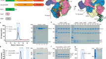 Plasmid-transformed BL21(DE3) cells were plated onto agar plates containing LB/carbenicillin (CBC, 50 μg/mL), and incubated overnight at 37 °C. A single colony was added into 1 liter LB medium containing antibiotics, and incubated at 37 °C and 250 rpm until the OD600 reached 0.6 to 0.8. Isopropyl β-d-thiogalactopyranoside (IPTG) was added to the cell culture at 1 mM working concentration, and the cell culture was incubated for another 4 h at 25 °C and 150 rpm29,30. Cells were harvested by centrifugation at 6000 rpm (JLA-8.1000 rotor, Beckman) for 20 min at 4 °C and cell pellets were suspended in the lysis buffer (50 mM Tris-HCl pH 8.0 and 500 mM NaCl). The cell lysate was first ruptured by a French press (Avestin) at 15,000–20,000 psi and centrifuged at 40,000 rpm (Type 45 Ti rotor, Beckman) for 1 h at 4 °C. The supernatant was incubated with Ni-nitrilotriacetic acid (Ni-NTA) resins (Qiagen) at 4 °C for 2 h. The resins were further washed with an imidazole gradient (0–40 mM) and eluted with 250 mM imidazole. The eluted proteins were concentrated and subjected to size-exclusion chromatography (SEC) on a Superose 6 Increase (GE Healthcare) column pre-equilibrated with 20 mM Tris-HCl (pH 8.0), 150 mM NaCl, 10 mM MgCl2, and 1 mM DTT. Overexpression of EcoLon-ΔN-E614K and ΔN-L709R in MG1655 cells, induced by 0.5% L-arabinose at 20 °C for 16 h, was confirmed by whole-cell Western blot analysis using a 6x-His tag monoclonal antibody at a 1:10,000 dilution (clone HIS.H8, Abcam ab18184), and further evaluated by Ni-NTA chromatography with production yields of 19.2 and 21.1 mg/L of culture, respectively (Supplementary Fig. 14). The anti-E. coli RNA Polymerase β (rpoB) antibody (clone 8RB13, Biolegend 663903, dilution 1:10,000) was used for an internal loading control.