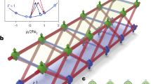 Our experiment starts with a BEC of 4 × 104 133Cs atoms in the hyperfine state \(\left|F=3,{m}_{F}=3\right\rangle\) in a cigar-shaped optical trap39. A pair of counter-propagating laser beams with wavelength λ = 1064 nm are used to illuminate the weakly trapped BEC (see Fig. 1a) and drive a series of two-photon Bragg transitions between discrete atomic momentum states p = 2mℏk, where ℏ is the reduced Planck’s constant, k = 2π/λ, and m labels discrete momentum states, taking integer values in the range [−6, 7]. The nearest-neighbor (NN) momentum states with an increment of 2ℏk are thus coupled, forming the one-dimensional (1D) momentum lattice illustrated in Fig. 1b27,28,40. In addition, the four-photon Bragg transitions are introduced to couple the next-nearest-neighbor (NNN) momentum states (see Supplementary Note 1)35,36. A triangular ladder consisting of 2 × 7 sites is subsequently visualized by mapping atomic momentum states into sites along different legs of the ladder, where the site index (ℓ, j) indicates the ℓth site along the jth leg (see Fig. 1c). The mapping relation between the discrete momentum states and sites in the synthetic triangular ladder is given by m = 2ℓ + j (see Supplementary Note 2 and Supplementary Fig. 1). Here ℓ takes integer values in the range [−3, 3], and j ∈ {0, 1}. With precise control of the NN and NNN coupling strengths, we individually set the inter- and intra-leg hopping rates as J/h = 0.4 kHz and K/h = 0.2 kHz, respectively. By imposing phases with alternating signs on the NNN couplings (see Fig. 1b), we thread each triangular plaquette with a synthetic flux ϕ.