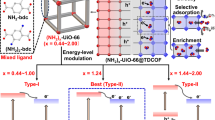 Powder X-ray diffraction (XRD) analysis confirms the crystallographic structure and phase purity of the resultant 3S-mesoUiO-66-NH2 HoMSs. The sharp and intense diffraction peaks of 3S-mesoUiO-66-NH2 HoMSs match well with those of microporous UiO-66-NH2 crystals (Fig. 1i and Supplementary Fig. 2), indicating the same crystalline structure of two MOF samples. Distinct from the microporous nature of UiO-66-NH2 nanocrystals, 3S-mesoUiO-66-NH2 sample shows two major capillary condensation steps in the relative pressure ranges of 0–0.05 and 0.60–0.85 in the N2 sorption isotherms (Fig. 1j), implying the coexistence of micropores and mesopores in MOF matrix. The specific surface area and total pore volume of 3S-mesoUiO-66-NH2 HoMSs are calculated to be 812 m2 g−1 and 0.64 cm3 g−1, respectively. The Barrett-Joyner-Halenda (BJH) mesopore size distribution (Fig. 1k) further reveals the average mesopore size is ~7.6 nm. The thermogravimetric (TG) analysis indicates that both the 3S-mesoUiO-66-NH2 HoMSs and microporous UiO-66-NH2 crystals exhibit similar thermal stability (Supplementary Fig. 3).