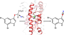 All protein crystallization was conducted at 20 °C under aerobic conditions using the sitting-drop vapor-diffusion method. Prior to crystallization trial, 8 mg mL−1 AetD-containing solution in a buffer containing 25 mM Tris-HCl [pH 7.5], and 150 mM NaCl was incubated with 5 mM indicated compounds for 30 min. Then 1 µL protein solution was mixed with 1 µL reservoir solution in 96-well Cryschem plates. The crystallization condition was optimized to 10 mM nickel chloride, 20% PEG 2000 MME, and 100 mM Tris [pH 8.5]. For no Fe crystals, crystals were soaked a cryoprotectant (mother liquid containing 15% ethylene glycol) prior to data collection. For Fe-containing crystals, crystals were soaked with a cryoprotectant containing 5 mM (NH4)2Fe(SO4)2 for 0.5 to 2 h prior to data collection. Notably, higher concentration of (NH4)2Fe(SO4)2 and longer soaking time could devastate the quality of diffraction such that careful examinations of multiple crystals were carried out to obtain satisfactory results. X-ray diffraction data were collected at beam line TPS05A of the National Synchrotron Radiation Research Center (NSRRC, Hsinchu, Taiwan) and processed by using HKL200025. The complex structure of AetD and 5,7-di-Br-L-Trp (1) was solved by the method of molecular replacement (MR) with a model predicted by AlphaFold226,27 as a search template. Subsequent model adjustment and refinement were conducted by using Refmac528, PHENIX29, and Coot30. Prior to structure refinement, 5% of randomly selected reflections were set aside for calculating Rfree as a monitor of model quality. The other complex structures were solved by MR with AetD/1/Fe as a search model. All protein structure figures were prepared using the PyMOL program (http://pymol.sourceforge.net/). Data collection and refinement statistics are summarized in Table 1.