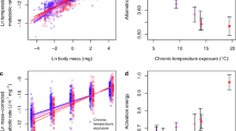 where T is the temperature of the chamber (\(K\)), \({T}_{0}\) is a normalisation constant set to the average temperature (\(K\)) of all the chambers for each case study, and \(k\) is the Boltzman constant (8. 617 × 10−5 eV K−1). The average temperature for each chamber was calculated over the same time period selected by the ‘auto_rate’ function to obtain the metabolic rate. \({I}_{0}\) varies depending on the type of organism5,62, whilst b and \({E}_{A}\) are often argued to centre around values of 0.75 and 0.65 eV, respectively1. We performed a multiple linear regression (‘lm’ function in the ‘stats’ package v4.1.3 of R) on the natural logarithmic transformation of Eq. 1 for each assay context to explore the main effects of temperature and body mass on the metabolic rate. Subsequently, metabolic rates were mass-corrected by dividing by \({M}^{b}\) (denoted as IM) and temperature-corrected by dividing by \({e}^{{E}_{A}{T}_{A}}\) (denoted as IT) to visualise the independent effects of temperature and body mass on metabolic rate, respectively. Moreover, we performed a supplementary analysis for the acute assays, including an extra categorical variable in Eq. 1 for the main effect of the source stream (S) that the fish were collected from (3 levels: IS1, IS12, and IS5).