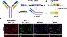 To construct and synthesize the 8-9D mRNA against SARS-CoV-2, optimized 5’-UTR and 3’-UTR, poly A tail (104 bp) and Cap1 were added to the mRNA sequence for the stability and high expression efficacy of mRNA. In addition, a Flag tag and V5 tag were included at the carboxy terminus of the heavy chain and light chain, respectively (Supplementary Fig. 7). SDS‒PAGE and Western blot analysis revealed the strong in vitro expression in HEK293T cells transfected with this construct (Supplementary Fig. 8a). Similarly, the translational efficacy of the 8-9D antibody was confirmed by the heavy chain and light chain specific immunofluorescence staining (Supplementary Fig. 8b).