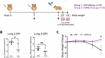 Studies with authentic SARS-CoV-2 Beta strain and Omicron BA.2 were performed in biosafety level 3 laboratories. Female 4 to 6-week-old K18-hACE2 transgenic mice were randomly allocated to groups (n = 5). For the prophylactic study, the mice were intravenously administered one dose of 5 μg of Liver-LNPs@mRNA8–9D or Lung-LNPs@mRNA8–9D, or PBS alone as a control. After 24 h, the mice were anesthetized and intranasally inoculated with 2 × 104 TCID50 of authentic SARS-CoV-2 Beta variant or Omicron BA.2 variant. The mice were euthanized 4 days post infection to harvest lung tissues and trachea tissues for virological assessment or histopathology evaluation. SARS-CoV-2 E gene sgRNA was quantified by quantitative reverse transcription-PCR (qRT–PCR) assays (sgRNA-F: CGATCTCTTGTAGATCTGTTCTC, sgRNA-F:ATATTGCAGCAGTACGCACACA). Standard curves were generated using serial dilutions of a cDNA plasmid of known concentration and used to calculate the level of sgRNA in copies per gram. For the post-exposure treatment, the mice were first anesthetized and intranasally inoculated with 2 × 104 TCID50 of authentic SARS-CoV-2 Beta variant or Omicron BA.2 variant, and after 24 h, the mice were intravenously administered one dose of 5 μg of Liver-LNPs@mRNA8–9D or Lung-LNPs@mRNA8–9D, or PBS alone as a control. The mice were euthanized 4 days post infection to harvest lung tissues and trachea tissues for virological assessment or histopathology evaluation.