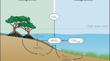 The buffer factor βH, which quantifies the resistance to pH changes at the addition of an acid or base, was five times higher in porewater than in surface waters. Furthermore, βH in porewater was two- to five times higher than in oceanic waters19 (Fig. 2e). This emphasizes the high buffer capacity of mangrove and saltmarsh porewaters. Earlier compilations of buffer factors in the marine systems have focused on coral reefs29 and the open ocean19. The spatial and temporal variability of buffer factor βH in mangroves and saltmarshes exceed other marine ecosystems. Therefore, the impact of the acid release from wetland porewaters on the pH varies considerably. The apparent paradox of increasing buffer capacity despite increasing acidification in intertidal wetlands can be explained by seawater reaching a minimum buffering capacity when TA = DIC at pH ≈7.5. Most carbonate ions become bicarbonate ions when the halfway point between dissociation constants of carbonic acid is reached19. When TA:DIC ratios further decrease after this minimum (<1), the water buffering capacity increases with increasing bicarbonate content9. Consequently, the increased buffer capacity of porewaters minimizes the acidification potential caused by CO2 release from intertidal wetlands.
