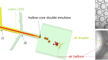 Standard pendant drop tensiometry with drop shape analysis was used to measure the interfacial tension between different pairs of dispersed and continuous fluids, as reported in Table 1 and as previously described32. Since the density of HFE 7500 oil is greater than the density of inner and outer fluids used in this study, pendant oil droplets were suspended within the inner or outer aqueous fluids to measure the interfacial tension. A metal capillary nozzle (27 gauge) was used to suspend oil droplets within 5 mL of inner or outer fluid. A custom MATLAB code was used to analyze the oil droplet shape and calculate interfacial tension, as previously established65,66. Briefly, shape analysis was conducted when the oil droplet was as stable as possible. Since droplets were observed at equilibrium, cohesive forces (interfacial tension) and gravitational deformation are balanced and the simplified Young-Laplace equation can be equated to hydrostatic pressure and solved to estimate interfacial tension. All reported interfacial tension measurements were the average of 3–6 analyzed drops.