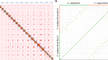 Chromosome pseudomolecules were segmented into 4,467 non-overlapping genomic windows of variable size, containing 100 Kb of non-repetitive DNA. This segmentation in windows of variable length and fixed low-copy DNA amount were used for analyses of SNP frequency, nucleotide diversity, gene and TE densities and C. canephora introgressions. Chromosome-scale visualization of tandem repeat structures with identity heatmaps were generated with StainedGlass64 using 2 Kb genomic windows. Synteny plots were obtained with SyRI65. Principal component values on aligned Hi-C reads were produced using the HOMER utility runHiCpca.pl66. PCA was applied to full chromosome distance-normalized interaction matrices at 50 Kb resolution. Each region along the chromosome represents a dimension in the analysis. It has been previously shown that the first eigenvector (PC1) broadly reflects clustering by chromatin type, i.e. heterochromatin or euchromatin and allows for identification of genome compartments67. A and B compartments were classified according to the sign of the first component (PC1) values, where positive values identified A compartments and negative values identified B compartments. Since the PC1 eigenvectors sign may be inconsistent across chromosomes, a manual correction of the signs was carried by direct inspection of the contact map.