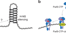 Intriguingly, the regulatory activity of VirB depends on its interaction with parS-like palindromic sequences (henceforth called virS) in the target promoter regions23,25,26,47,48,49. These recognition sites can be located more than 1 kb upstream of the corresponding transcriptional start sites48,50, indicating that VirB does not stimulate gene expression through a direct interaction with RNA polymerase. A series of studies showed that VirB indeed acts at a distance and counteracts the silencing of target promoters by the histone-like nucleoid-structuring protein H-NS, which associates with AT-rich regions in the surroundings or downstream of virS sites26,48,49,50,51,52. This anti-silencing mechanism was proposed to involve the spreading of VirB from its DNA recognition site, because the insertion of a roadblock between virS and the H-NS binding regions abolished the regulatory effect of VirB49. Consistent with this notion, recent work has shown that the virS-dependent interaction of VirB with promoter regions causes large-scale changes in DNA topology, leading to a local decrease in negative supercoiling that alleviates H-NS-mediated gene silencing53. However, the molecular mechanism underlying the spreading of VirB and its effect on DNA topology are incompletely understood.