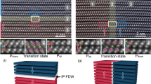 Density functional theory (DFT) calculations indicate an in-plane polarization with a magnitude of 1.517 eÅ per In2Se3 (1.7 × 10−10 C m−1) along the a axis. This polarization is pointing from the higher central atom to the lower one, as denoted by the green arrows. The in-plane ferroelectricity of the β′ In2Se3 stems from the displacement of the central-layer Se atoms from their highly symmetric positions, as illustrated in Fig. 1a. This figure elucidates the nature of the in-plane electric polarization in β′ In2Se3. Due to the reduced symmetry of the β′ phase that originates from the β phase29, various polar domain boundaries have been observed between domains with different relative rotational angles in the β′ phase36. The majority of the observed domain boundaries are 60° and 120°, with a distribution of ~ 72% for the 60° domain boundaries and ~27% for the 120° ones. Rarely, other types of domain boundaries that can not be well defined or can be interpreted as structural line defects that separate domains (one of them shown in Supplementary Fig. 1) were observed, which account for ~1% of all the observed domain boundaries. In the following sessions, we focus on the 60° domain boundaries since they are abundant and usually straighter and more ordered than the 120° ones36. Based on the polarization directions of neighboring domains, the domain boundaries can be divided into the head-to-tail, tail-to-tail, and head-to-head types. Figure 1c shows the domain configuration for the 60° tail-to-tail boundaries. The angle between the polarization vectors of adjacent domains is indicated in green. The boundary serving as the angle bisector is marked with black dashed lines. Figure 1d is a large-scale STM image with a 60° domain boundary. The tail-to-tail type is determined by the zoom-in STM images obtained in the green boxes on each domain in Fig. 1d (see Supplementary Fig. 2a, b in the Supporting Materials).