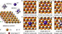 All the spin-unrestricted DFT calculations with Hubbard U (DFT + U) corrections were performed using the Vienna ab initio simulation package (VASP). For the description of exchange-correlation effects, the Perdew–Burke–Ernzerhof function within the generalized gradient approximation was employed37. A plane wave basis set was generated with a kinetic energy cutoff of 450 eV, and k-points were sampled using a 3 × 3 × 1 and 5 × 5 × 1 Gamma mesh for geometry optimization and electronic structure calculations of all intermediates on NiOOH (001), Ir1/Ni LDH-T, and Ir1/Ni LDH-V, respectively. For a better description of the 3d electrons, the Hubbard effective term Ueff = 4.4 eV for Ni was added to the PBE functional through the rotationally invariant approach proposed by Dudarev and co-workers38. A 3 × 3 single-cell NiOOH (001) surface with double atomic layers consisted of 36 oxygen atoms, 18 Ni atoms, and 18 H atoms. A vacuum layer of 15 Å in the z-direction was set to avoid unwanted interactions between periodic images. The convergence of energy and force were set to be 10−5 eV and 0.03 eV/Å, respectively. The DFT-D3 method was adopted to take van der Waals correction into consideration39.