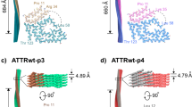 The comparison of the secondary structure of ATTRv-I84S fibrils to native transthyretin reveals significant changes that would entail major unfolding and reassembly of the tetramer (Fig. 4 and Supplementary Fig. 10). While all four ATTRv-I84S fibril folds share similar secondary structures with minor variations, they do not coincide with the secondary structure profile of the native tetrameric transthyretin (Supplementary Fig. 10). Residues Ala 36 to His 56, missing in the structure of ATTR fibrils, are located on the outside of the tetrameric protein and contained both structured (β-strands) and unstructured (loop) regions surrounding strands C and D (Supplementary Fig. 10 and Fig. 4b, c). The residues involving the gate (Leu 58 to Gly 67) of the ATTR fibrils are also located on the outside of the tetrameric protein and are unstructured (Supplementary Fig. 10 and Fig. 4b, c). The significance of this is yet to be determined.