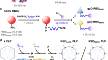 DBCO-bearing DNA-VLPs were functionalized with RBD-Az to yield DNA-VLP-1x, DNA-VLP-6x, DNA-VLP-30x or DNA-VLP-Cy5-30x. At least 150 nM of DNA-VLP-30x-DBCO or DNA-VLP-Cy5-30x-DBCO and at least 750 nM of DNA-VLP-1x-DBCO or DNA-VLP-6x-DBCO were incubated with 30 equivalents per DBCO group of RBD-Az in PBS at room temperature for 24 h. RBD-functionalized DNA-VLPs were purified into PBS by drop dialysis (mixed cellulose ester, 0.025 µm) and stored at room temperature for less than 7 days. Purity and monodispersity of the DNA-VLPs were validated by AGE (1.6% agarose, TAE buffer with 12 mM MgCl2, EtBr, 65 V for 150 min at 4 °C) and dynamic light scattering (DLS, Malvern Zetasizer Ultra). Coverage with antigens was measured using Trp fluorescence spectroscopy53 at 100 nM RBD and denaturing, reversed-phase HPLC as previously performed (BEH-C18 column; 30 °C; 0.1 M triethylammonium acetate in water:acetonitrile gradient)48.