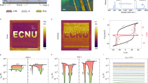 In the positive-up-negative-down (PUND) measurement mode (Supplementary Fig. 2), the FTJ with 1-nm-thick BSO layer shows a standard macroscopic hysteresis loop, by integrating the switching current curve (Fig. 1d). The remanent polarization up to 16.6 μC/cm2 has been obtained, which is the foundation for achieving nonvolatile switching with a high TER. Piezoresponse force microscopy (PFM) measurements also demonstrate clear ferroelectric properties of the 1-nm-thick BSO films, with the out-of-plane phase showing obvious ferroelectric domain walls (Fig. 1e). The phase of the unbiased region is consistent with that of the region biased at +7 V, which proves that the ultrathin BSO films have intrinsic ferroelectric properties. The amplitude vs. voltage curve of the off-field local PFM presents a butterfly shape (Fig. 1f), which is a typical piezoelectric characteristic24. For BSO films with different thicknesses, the coercive fields and remanent polarizations are summarized in Supplementary Table 1.