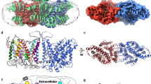Full-length canonical human AE2 (isoform 1), fused with a C-terminal green fluorescence protein (GFP) and an affinity tag, was expressed in HEK293F cells33. Recombinant AE2 protein was extracted from membranes using lauryl maltose neopentyl glycol (LMNG) and cholesteryl hemisuccinate (CHS) and then LMNG exchanged with glycol-diosgenin (GDN) by size exclusion chromatography. Purified proteins were then subjected to cryo-EM analysis and a structure of the AE2 TMDs in an inward-facing conformation at 3.2 Å resolution was determined (Supplementary Fig. 1). The TMDs of AE2 form a homodimer with two protomers in the same conformation and occupy a 3D space of approximately 110 Å × 65 Å × 65 Å (Fig. 1a, b). Each protomer is comprised of 14 TM helices, resembling the arrangement of UraA34, with a core domain formed by TMs 1-4 plus 8-11, and a gate domain formed by TMs5-7 plus 12-14 (Fig. 1c, d), similar to other SLC4 family proteins21,22,23,26,35. The density corresponding to the cytoplasmic NTD could not be identified because of its flexibility suggesting a weak interaction between the NTD and TMD in this conformation (NTD located away from TMD) (Supplementary Fig. 2a). Similar to the NTD, partial densities of extracellular loop (EL) 3, EL4, EL6 and the cytoplasmic C-terminus were less well-solved (again due to the flexibility of these regions) and were not included in our models. The dimer interface between the TMDs was formed by hydrophobic interactions between TM6, IL4, and IL7 (Supplementary Figs. 2b, c), and by hydrogen bonds and electrostatic interactions between EL3 and EL4 (Supplementary Fig. 2d). The disulfide bond formed between C855 of the two protomers stabilized the dimer interface (Supplementary Fig. 2d) and as such, may affect the sensitivity of AE2 to pHe as well as AE2 substrate transport activity36. The substrate coordination site was accessible from the cytoplasmic side of AE2 with a density likely corresponding to Cl− (Supplementary Fig. 2e). The high-resolution map allowed us to unambiguously identify density features corresponding to PIP2 molecules with incompletely visualized and defined acyl chains (Supplementary Fig. 2f), located at the TMD dimer interface (Fig. 1a–c). Therefore, we designated this structure as the AE2Inward Facing/with PIP2 (AE2IF/PIP2) state.