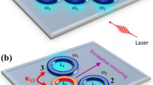 Following Floquet theory, the stroboscopic dynamics of our Floquet Hamiltonian are described by the time-evolution operator over a complete driving period, i.e., \({U}^{\uparrow,\downarrow }{{{{{\mathscr{=}}}}}}{{{{{\mathscr{T}}}}}}{e}^{-i{\int }_{0}^{T}H\left(t\right){dt}}\), where \({{{{{\mathscr{T}}}}}}\) executes the time ordering, and T is the temporal period. We calculate the effective Hamiltonian Heff of the Floquet PT model given by \({H}_{{{{{{\rm{eff}}}}}}}={{{i}}}\log \left[{{{{{{\rm{U}}}}}}}^{\uparrow,\downarrow }\left(T\right)\right]/T\). In Fig. 2a, we show the quasi-energy spectra (real part, red; imaginary part, blue) for T = 3.626/κ, compared to the spectrum in Fig. 2b (red curve, red; imaginary part, blue), corresponding to the static scenario. The Floquet bands repeat themselves in quasifrequency dimension because the discrete time translation symmetry is preserved up to the period T. It is evident that the PT-symmetry phase transition, in which the spectrum evolves from real-valued to complex-valued through exceptional points (EPs), occurs at much smaller values of Γ for the Floquet system compared to the static regime. To explain this finding, we translate the static PT-symmetric energy spectrum (red line) by the Floquet frequency Ω = 2π/T, resulting in band crossing of different Floquet orders. The interaction of these Floquet bands under the periodic modulation leads to the emergence of new EPs, and PT-symmetry phase transitions in the Floquet quasi-energy spectra of Fig. 2a. Hence, the crossing points and resulting EPs can be tuned through the Floquet frequency Ω, and the Floquet PT-symmetric system can be in the broken phase even for vanishingly small non-Hermiticity parameter, provided that the Floquet frequency matches the bandwidth of Hermitian energy Ω \(\approx\) 2κ. Overall, the Floquet PT-symmetric system enables wide control over EPs and phase transitions through the modulation period, facilitating the implementation of exotic wave phenomena.