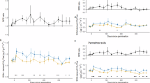 Most statistical analyses were performed in R software (version 4.2.2). The difference among 16S rRNA gene abundances was determined by the one-way ANOVA with a permutation test (Perm-ANOVA) using the lmPerm R package (version 2.1.0). The statistical significance of the response ratio analyses for both the GeoChip and DOM data was assessed using the Response Ratio Test110. The structural differences for microbial communities between warming and control samples based on 16S rRNA gene sequence data and GeoChip data were determined by PCoA using vegan R package (version 2.4.6). Since we have identified which ASVs are the potential active degraders in warming or control groups, the unique representative sequences from those active ASVs were used to search for the same ASVs from the 16S rRNA gene sequencing data spanning 2010-2016 (The data is available in the NCBI Sequence Read Archive under project no. PRJNA331185)14. The linear mixed-effects model (LMM) in the lme4 R package (version 1.1–35.1) was used to determine warming effects on the relative abundance of those active ASVs during 2010–201614. Based on the LMM, the means of relative abundances for the active ASVs were least-squares means (estimated marginal means) produced by the emmeans function in the emmeans R package (version 1.9.0)14. The difference between respiration and the priming effect was determined by repeated-measure ANOVA in the vegan R package (version 2.4.6). Linear models were used to detect correlations among microbial communities and C fluxes in the stats R package (version 3.5.2), which was subsequently tested for significance by permutation tests in the lmPerm R package (version 2.1.0). Mean values and standard errors of the mean are calculated. Unless otherwise stated, values of p ≤ 0.050 were considered to be significant. The congruence between taxonomic and functional gene compositions, and between the DOM and functional gene compositions was determined by Procrustes analysis86,111 of PCoA coordinates with the Bray-Curtis dissimilarity metric. The statistical significance of the Procrustes analysis (i.e., M2) was assessed using the PROcrustean Randomization Test (PROTEST)112. This involved permutating the data 999 times to evaluate the significance. The analysis was conducted using the vegan R package (version 2.4.6).