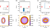 We study the skyrmions motion driven by SAWs in Ta (5 nm)/Co20Fe60B20 (CoFeB, 1 nm)/MgO (1 nm)/Ta (2 nm) multilayers, because the multilayers show a weaker pinning effect than that in Pt/Co/Ta multilayers10,20. This is due to the fact that the amorphous CoFeB has a strong magnetoelastic coupling and a low damping parameter44. The magnetic properties of the multilayers on a LiNbO3 substrate were characterized by a polar magneto-optic Kerr effect (MOKE) magnetometry (Supplementary Fig. S1a). The average diameter of skyrmions generated by magnetic field pulses is estimated to be around 1 μm (Supplementary Fig. S1c). The multilayers and interdigital transducers (IDTs) were integrated on a 64°Y-cut LiNbO3 piezoelectric substrate, as shown in Fig. 1h (optical image of the fabricated devices is shown in Supplementary Fig. S1d). By controlling the angle between the SAW propagation direction and the orientation of the piezoelectric substrate, the piezoelectric constant matrix can be transformed (see Supplementary Information Note 2), and thus the SH wave or Rayleigh wave can be generated independently with the wave propagation along the x or y direction, respectively (Fig. 1d). Figure 1i shows a transmission spectrum (S12) between two IDTs, which is obtained by using a vector network analyzer where the resonance frequencies of the SH wave mode and the Rayleigh wave mode are 486 MHz and 451 MHz, respectively. The propagation attenuation of the SH wave mode in the 64°Y-cut LiNbO3 crystal is larger than that of the Rayleigh wave mode, resulting in a lower resonant peak for the SH wave compared to the Rayleigh wave.