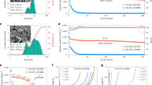 Lithium hexafluorophosphate (LiPF6, >99.99%) salt was purchased from Gotion, and Li chips with a thickness of 250 µm were purchased from MTI Corporation. The reference electrolytes 1.0 M LiPF6 in EC/EMC = 50/50 (v/v) (battery grade) and fluoroethylene carbonate (FEC, 99%) were bought from Sigma-Aldrich. Methyl (2, 2, 2-trifluoroethyl) carbonate (FEMC, >98%), 1, 1, 2, 2-tetrafluoroethyl 2, 2, 3, 3-tetrafluoropropyl ether (TTE, >97%) and tetramethylene sulfone (SL, >99%) were purchased from TCI, US. All the solvents were dried over activated molecular sieves (4 Å, Sigma-Aldrich) to make sure the water content was less than 10 ppm (Karl-Fisher titrator, Metrohm 899 Coulometer). The LiNi0.8Co0.15Al0.05O2 (NCA) cathodes coated on Al foil with a loading of 4.0 mAh cm−2 were kindly provided by Saft America, Inc. For the SiMP electrodes, a slurry was first prepared by dispersing SiMPs (1–5 μm, TCI, US, as-received, as revealed by SEM in Supplementary Fig. 23), lithium polyacrylate binder (10 wt% aqueous solutions) and Ketjen black in water with a weight ratio of 6:2:2. The slurry was cast onto a copper (Cu) foil, dried at room temperature for 24 h and further dried at 90 °C overnight under vacuum. μSi electrodes with a loading of 1.2 mg cm−2 (corresponding to 4.3 mAh cm−2 from a theoretical value of 3579 mAh gSi−1) were obtained. The μSi electrode processing is the same as that of commercial graphite electrodes without any additional pretreatment or pre-lithiation.
