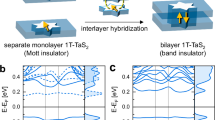 The optimized interlayer distance between 1T and 1H layers is dint = 5.81 Å (see Methods section for details), which is close to the experimental value (~5.90 Å) of the bulk 4Hb-TaS218,20. The band structure of this bilayer exhibits two empty, degenerate flat bands at 0.1 eV above the Fermi energy, as shown in Fig. 2a, which originate from a half-filled flat band of monolayer 1T-TaS2. This is consistent with previously measured dI/dV spectra of the 1T-TaS2 layer in the cleaved 4Hb-TaS2 sample17,18,19 where 1e is transferred from the 1T to the 1H layer. After increasing the interlayer distance to dint = 6.3 Å, the charge transfer is reduced to 0.6 e, and the spin-polarized band structure shows a partially filled spin-majority lower band, with the spin-minority upper band being empty, as shown in Fig. 2b. Additionally, we stress the significance of the van der Waals interaction in calculations on the bilayer. For example, one can obtain an artificially enlarged optimum interlayer distance dint = 6.8 Å without including a van der Waals correction.