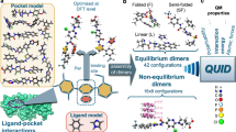For each target, the default models were defined as residues of the representative protein within 10 Å of all the overlaid ligands and amounted to 1,295–2,298 atoms (a residue is selected if at least one of its atoms fits within the cutoff distance). The trimmed models comprised 6 Å surroundings (only in the cases of 02-HIV-PR and 06-BACE1 it was reduced to 5 Å because of the large size of the ligands) of all the overlaid ligands and were made up of 753–1,096 atoms. The protein backbone was then terminated with neutral caps of the peptide bond that introduce the least perturbation into the system (-NH-CH3 at the C-terminus and -CH = O at the N-terminus). Truncating the active site model could expose charged amino acid residues at the boundary; we did not neutralize these as they were far from the ligands and were effectively screened by the solvent model. The P–L models were gradually relaxed in a series of optimizations. First, we performed annealing (60 ps molecular dynamics with a thermostat cooling of the system from 300 to 0 K) and optimization of the hydrogen atoms in the protein only. Second, we formed the P-L complexes, and possible clashes with the protein were resolved by local geometry optimizations at the MM level. The final step was a free gradient optimization of the ligand and its surroundings (all protein residues within 4 Å of all the ligands) in an aqueous environment using a hybrid SQM/MM approach where the SQM part (treated with PM6-D3H4X) comprised only the ligand. The optimizations were performed in Cuby4 (http://cuby4.molecular.cz)29, which also provided the interface implementing the SQM/MM scheme. The final structures used for the scoring are available in a public repository (https://github.com/Honza-R/PL-REX) and are referred to as PL-REX geometries.