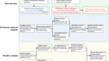 To assess the association between SNPs and five susceptibility scores (as a continuous variable) respectively, we used mixed linear model (MLM)-based models for GWAS analysis, adjusted for sex, birth year, genotyping array, and the first ten principal components61. Independent significant SNPs with p < 5 × 10−8 were identified for each genomic locus. The inflation of GWAS analyses was tested by LD score regression62. Together with surrounding genomic loci that were identified based on LD structure at r2 ≥ 0.6, all the SNPs were further mapped to identify potential genes using the web-based platform FUMA (http://fuma.ctglab.nl/)63. The strategies for gene mapping included positional mapping, expression quantitative trait loci mapping based on the GTEx v8 Project64, and Chromatin interaction mapping65,66. Further, these mapped genes were included in the gene-set enrichment analyses based on Metascape (https://metascape.org/) to identify underlying biological pathways for each disease cluster with the following ontology sources: KEGG Pathway, GO Biological Processes, Reactome Gene Sets, Canonical Pathways, CORUM, WikiPathways, and PANTHER Pathway67. To further investigate genetic overlap across disease clusters, the abovementioned mapping genes were included in the PPI network enrichment analysis to identify protein network components using the Molecular Complex Detection (MCODE) algorithm based on Metascape68 based on the following genomic interaction databases: STRING69, BioGrid70, OmniPath71, and InWeb_IM72. To test whether these identified cluster-specific genes are associated with any of the individual diseases in each disease cluster, we first conducted hypergeometric tests using the function of “GENE2FUNC” in the website platform ‘FUMA’. As an alternative approach serving a similar purpose, we searched GeneCards, a gene database providing all annotated and predicted human genes (https://www.genecards.org/), to identify traits that have been previously associated with the top 20 identified genes of each disease cluster.