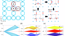 We use a honeycomb lattice of microwave resonators with site-dependent coupling strengths (see Fig. 1a)55 to obtain the ABF energy spectrum. The resonators are labelled by Aijk and \({B}_{ijk}\) for A and B sublattices, with i, j, and k being the indices in \({{{{{{{{\bf{e}}}}}}}}}_{1}=(-\sqrt{3}/2,-1/2)\), \({{{{{{{{\bf{e}}}}}}}}}_{2}=(\sqrt{3}/2,-1/2)\) and e3 = (0, 1) directions, satisfying i + j + k + (ξ + 1)/2 = N with ξ= − 1 and 1 for A and B sites, respectively. At the triangular lattice boundary one of i, j, k becomes zero, corresponding to the vacuum state in FSLs. In total, the honeycomb lattice contains (N+1)2 sites. The coupling strength between Aijk and Bi−1jk site is \(\sqrt{i}{t}_{0}\), and the same rule applies to j and k. The square root factors are introduced to emulate the couplings between different harmonic states55,56,69,70,71, which involves the properties of bosonic annihilation operators. In the lattice the coupling strengths vary from t0 to \(\sqrt{N}{t}_{0}\), in a range smaller than the existing proposals51,52 by a factor of \(\sqrt{N}\), which facilitates the following experimental realization. These couplings are described by the tight-binding Hamiltonian,