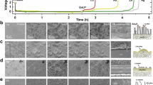 Figure 5g–j and Supplementary Fig. 30 show the surface morphology evolution of Li@Cu and Li/LiZn@Cu electrodes after repeated Li plating/stripping. As shown in Supplementary Fig. 30a, b, a thick SEI layer with huge cracks is observed on the Li@Cu surface after 50 cycles at 1 mA cm−2 and 1 mAh cm−2. This thick and exfoliated SEI is composed of the stacked “dead Li”, arising probably from the undesired Li dendrite and the repeated rupture of SEI. Moreover, the cross-section SEM images of Li@Cu exhibit a completely deteriorated interface morphology, which would hamper the mass transfer process for the ion/electron transportations as shown in Supplementary Fig. 30c, d. In contrast, a homogeneous deposition layer (~34 μm) consisting of numerously compact Li grains is formed on the Li/LiZn@Cu surface as shown in Fig. 5g–j. This signifies that the multi-functionalized LiZn alloy can well regulate the homogeneous Li deposition and restrict the uncontrollable volume expansion to promote the electrochemical performance. It can be further seen from the EIS analysis that as shown in Supplementary Fig. 31, the semicircle at high frequency corresponds to the Li-ion transport inside the SEI (RSEI), which decreases and almost stabilizes in Li/LiZn@Cu electrode, while it gets smaller first and then bigger from the 1st cycle to the 50th cycle, reflecting the deterioration of interface dynamic process in Li@Cu.