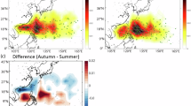 where \(\alpha\) is the factor to reduce gradient wind by friction for 10-m wind as 0.8 by default, \({C}_{k}/{C}_{D}\) is the ratio of the exchange coefficient for enthalpy (\({C}_{k}\)) to the drag coefficient (\({C}_{D}\)) as 0.9 by default, replaced by 1.0 in this study, \({T}_{s}\) is the SST, \({T}_{o}\) is the outflow temperature, CAPE* is the convective available potential energy of saturated air lifted from sea level to the outflow level, and CAPE is that of the environment near the radius of maximum wind (RMW). The 6-hourly ERA5 and daily GLORYS data 2 days before the TC arrival were used to calculate the 6-hourly PI. For the climatological PI, monthly ERA5 and ORAS5 were used.